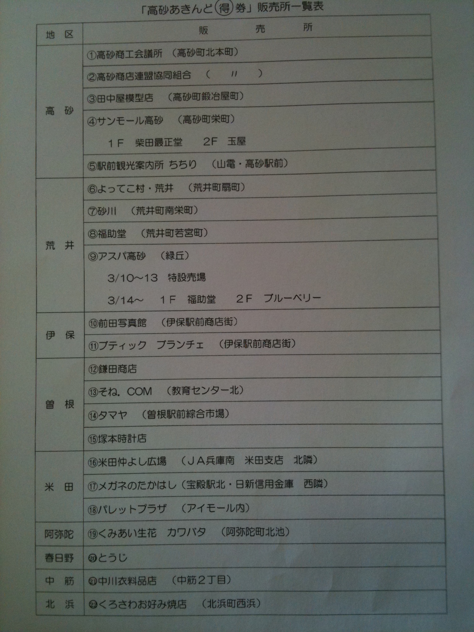 このあきんど券は高砂市内の取扱店にてお買い物に利用できます。