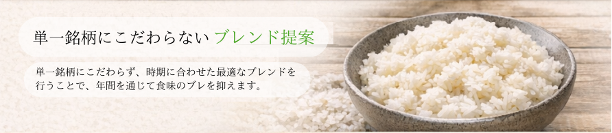 年間を通じて安定した味わいを維持するため、単一銘柄に限定せず、複数銘柄をブレンドしたお米をご提案。季節や収穫状況に左右されにくい、安定した品質を実現しています。