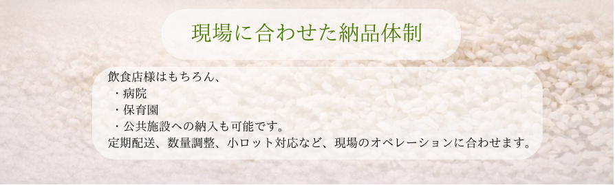 さらに、炊飯単位に合わせた小分け対応も可能。現場の作業効率向上やロス削減にも貢献いたします。