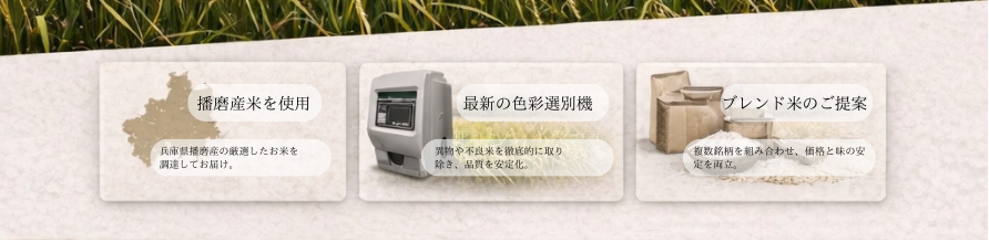 兵庫県・播磨地区の米を中心に、年間を通じて安定した味と品質を。