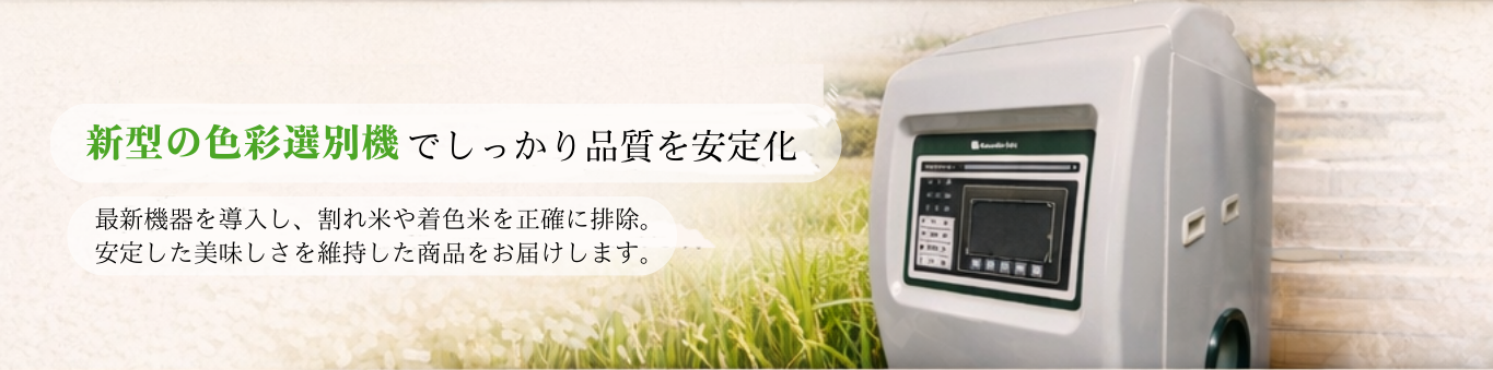 新型の色彩選別機を導入し、焼け米やシラタなどを丁寧に取り除くことで、見た目・炊き上がり・味の均一性を高めています。